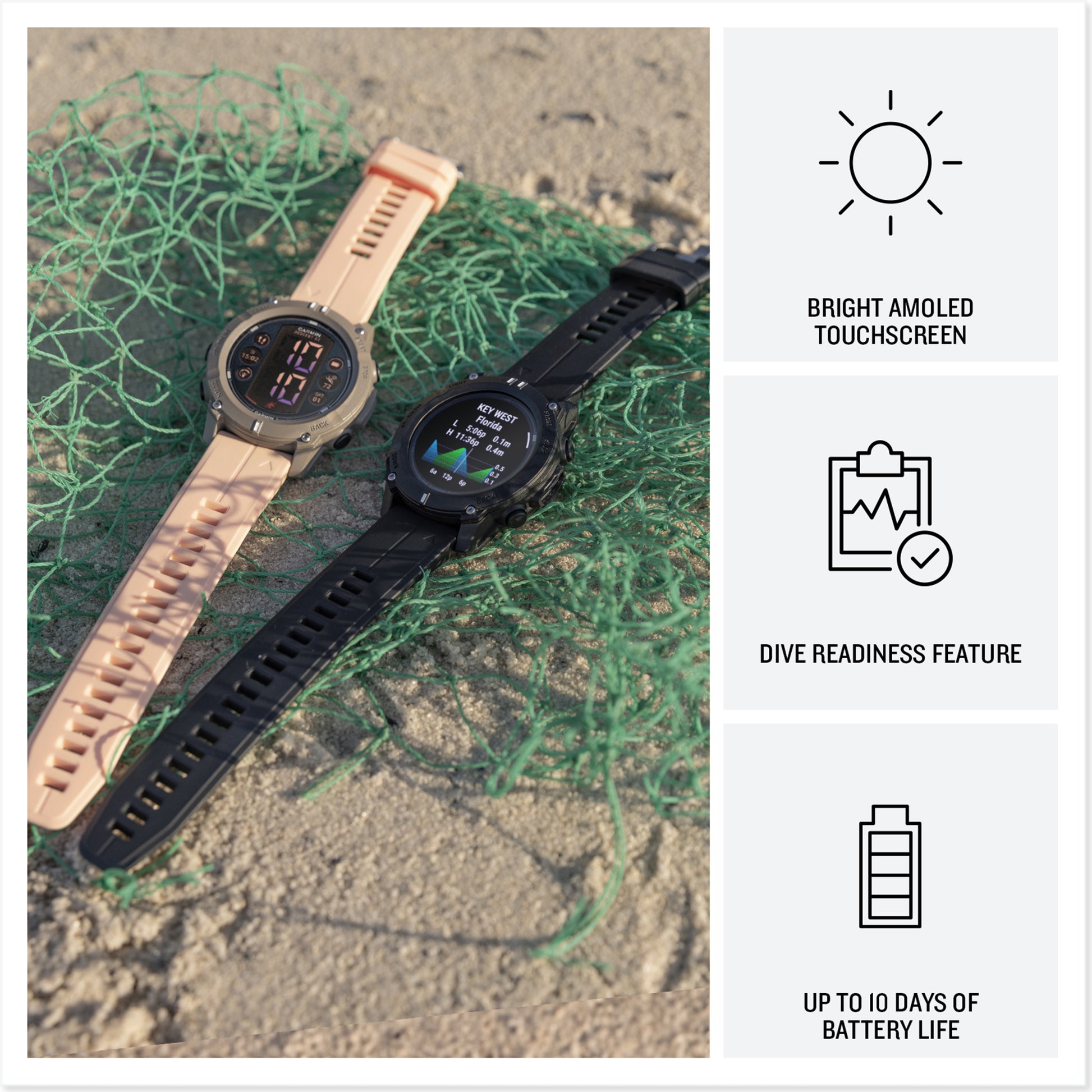• Battery life: up to 27 hours in dive mode and up to 10 days in smartwatch mode