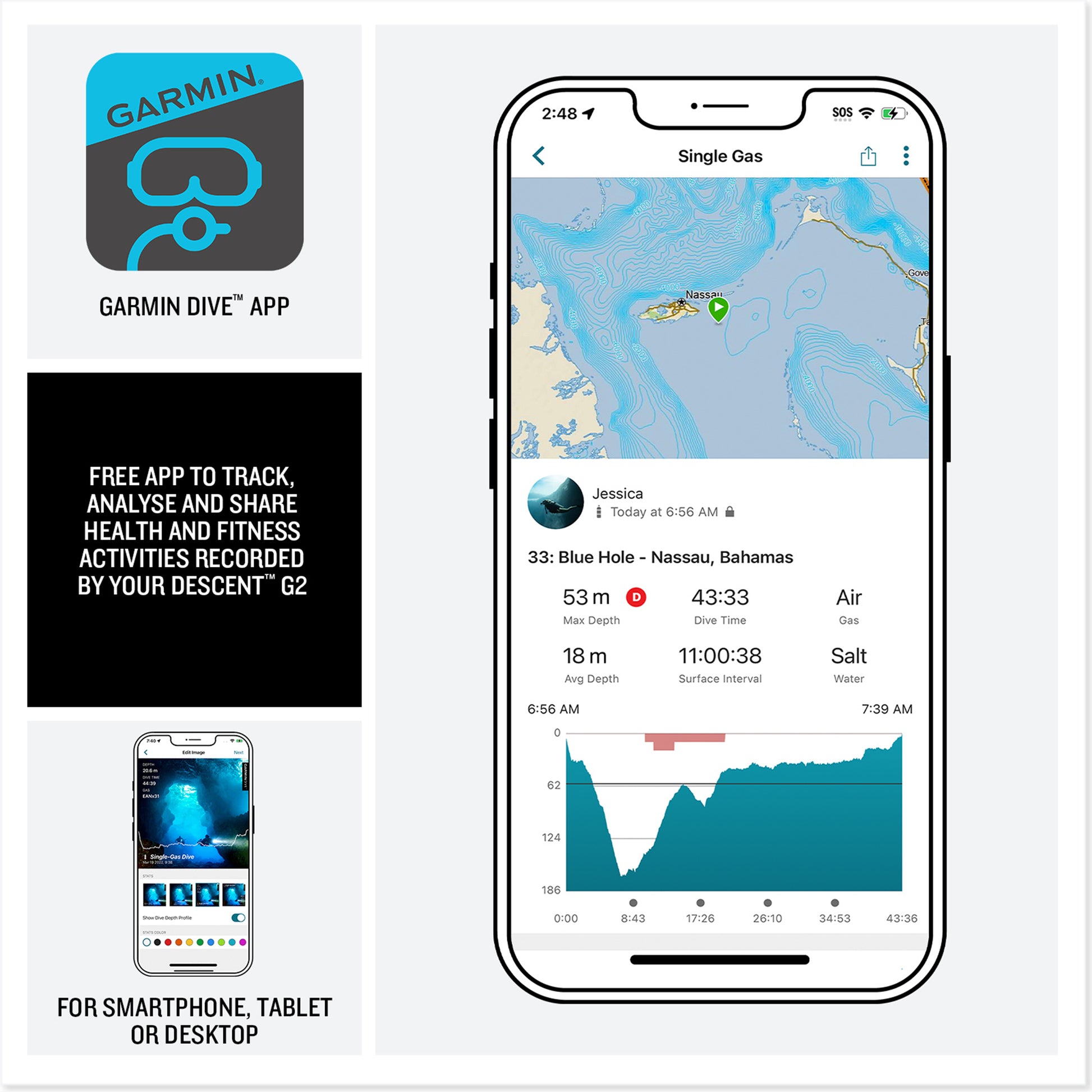 • Store dive logs on device, and review in the Garmin Dive™ smartphone app