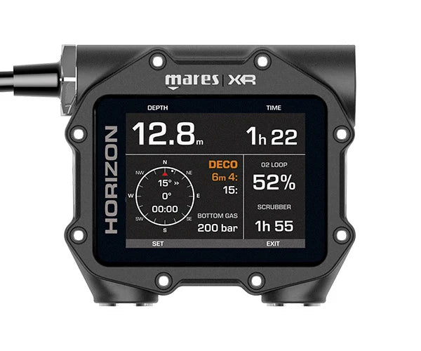 This intelligent computer is effortlessly operated via two large piezo elements, especially when wearing gloves, and includes a scrubber monitoring system to keep the diver informed of their scrubber status at all times, and an audible warning alarm.